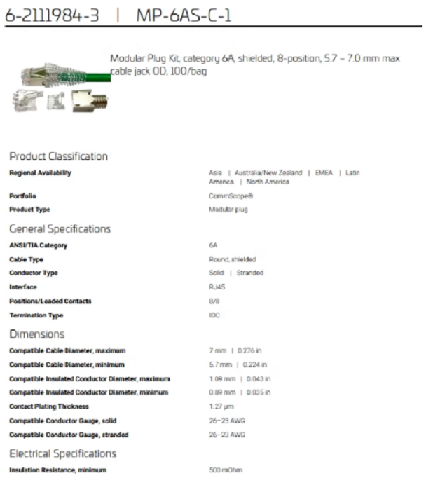 6-2111984-3 MP-6AS-C-1 COMMSCOPE康普六類屏蔽水晶頭,超六類RJ45接頭